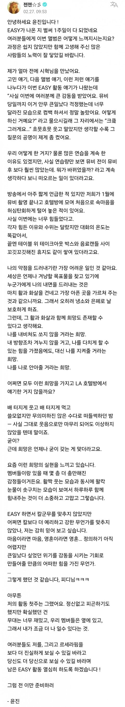르세라핌 허윤진 장문의 위버스글 업뎃