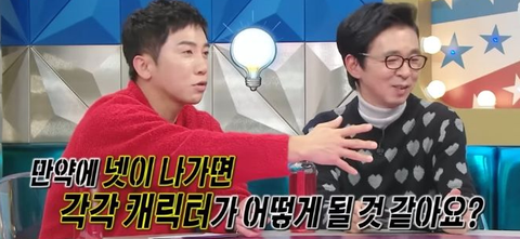 유세윤이 넷이 나가면 각각 캐릭터가 어떻게 될 것 같냐고 물어봄