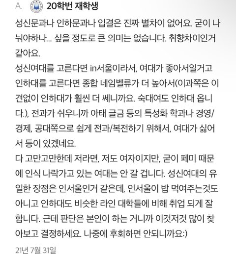 그럼 다른여대들과 비교했을때 반응을 어떨까? (숙대, 성신)