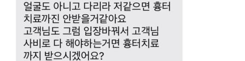 저- 사장님 화상입은걸 갑자기 제탓으로 돌리시네요. 사장님 다리가 저렇게 됬어도 이렇게 말씀하실건가요? 4만원 벌자고가 아니라.. 지금 제 심정은 4만원도 환불받고 싶은 심정인데 제가 사장님 배려해드린거란 생각은 안드시나요?