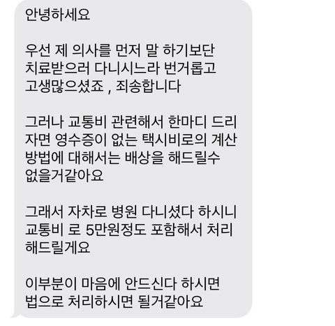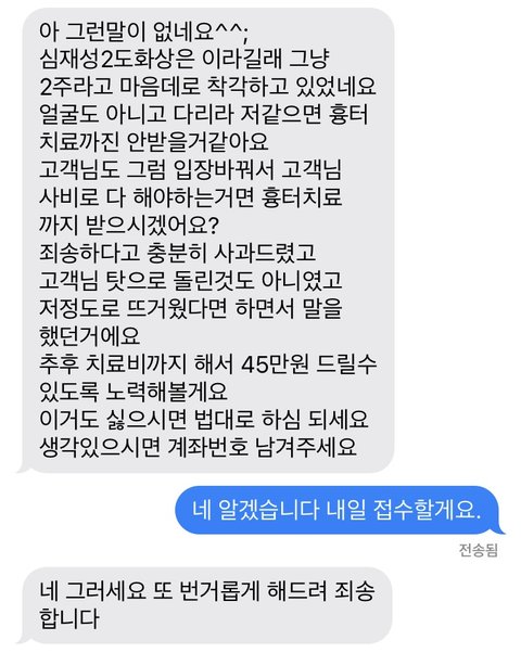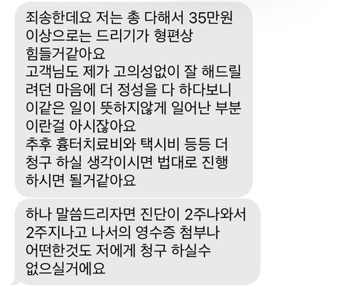 저는 그냥 조용히 끝내고 싶었는데요. 찜질도 잘해주실려고 한거 알고 좋게 생각했으니 단순치료비만 요청 드렸던건데 이렇게 나오시면 저도 생각을 더 해봐야 할것 같아요.