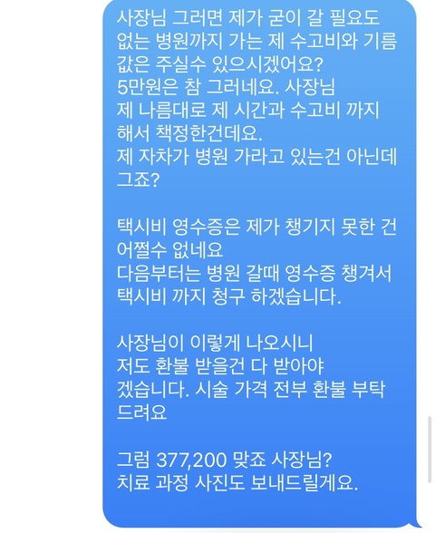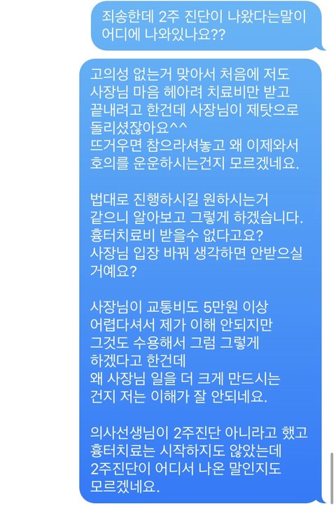 통화할때도 제가 화를 안냈던건 사장님이 당연히 일부러 하신거 아니고 사고 라고 생각했기 때문이다. 좋게 해결되길 바래서 치료비만 받으려고 한건데 갑자기 제탓을 하시니 저역시도 당황스럽다.