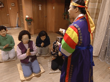 무당이 사람들 한 명 한 명에게 팥 촥촥 뿌리고