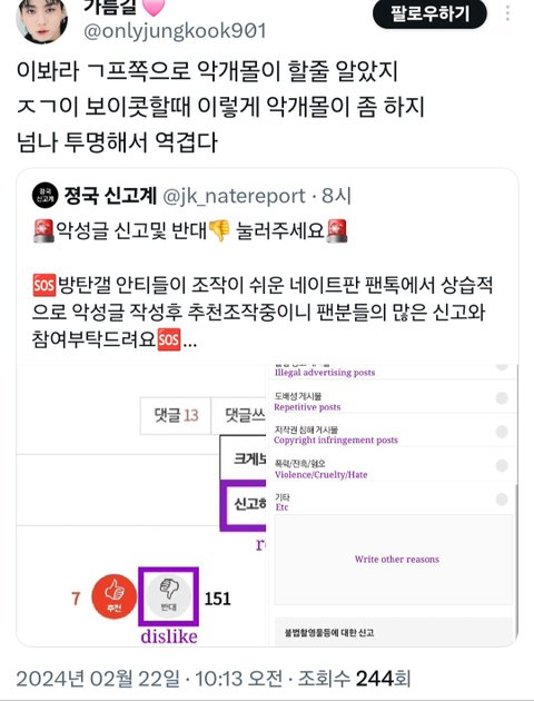 정국팬들 신고계에서 좌표쓰고 관리하는데? 유명한 악개들만 여기에 댓달던데 ㅋㅋ