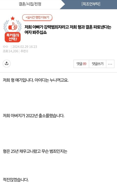 25년형 이면 정말 강력범죄 라는건데... 나도 좀 무서울 것 같아요 미리 알았으면 결혼 할 생각 안했겠죠.. 미리 얘길 하지 그러셨어요? 내 생각에는 문제가 아닌것들이 다른 사람에게는 문제가 될 수 있습니다. 판단은 각자가 하는것으로 이게 맞다 아니다 할 수 없어요. 형이 억울하겠지만 접어야 하는게 맞을듯 나도 이상한게 있지만 조씨를 피합니다. 그냥 조씨가 범죄자가 많게 생각이 들고 내가 만나 본 조씨들은 성격이 다 이상하다 생각해서 어느순간 조씨는 피합니다.. 이렇게 각자의 사정이 있듯 여자의 결정을 따라 줘야 하듯하네요