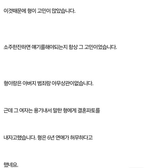 자식한테 업보가 간다는게 다 저런거임. 도망간 여자는 정상인거고 파토난 형은 부모의 업보를 받은거임. 25년형 무게만큼 너와 네누나와 형의 평생에 걸쳐 꼬리를 달고다닐거임. 너거아빠 강력범죄자ㅋ.라고. 지 대에서 선행하고 살며 업보 못끊으면 한대 더 내려가는거지..글적는꼴 보니 비슷한 집안(범죄자)못만나면 답없는데..