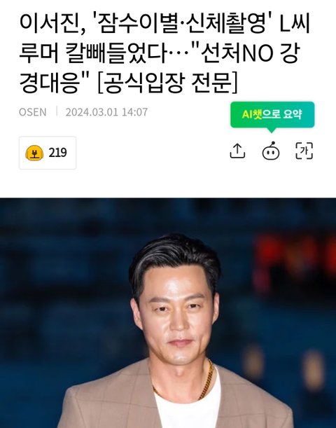 이서진 이미지가 생각보다 꽤 안좋은거 이제 알았겠네. 근데 예능에서 개쿨한척하면서 근심걱정도없는편이고 악플따윈 찾아보지도 신경도안쓴다고 하던데 ㅎㅎ 악플러고소도중요하지만 최초유포자를찾아서 처벌하는게 제일중요한거아닌가?ㅎㅎㅎ