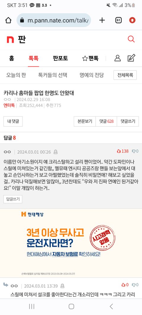 에스파 멤 전체한테 호감있는데 카리나 보면서 공공즈랑 친한걸 티내고싶어하는거 같다고 느꼈음 그 ㅈㅁ 시상식에서 아이고 할때 따라하는거 보고 느낌 챌린지 찍었을때 반응이 글케 좋진않았는데 굳이 시상식에서 그러는거 보고 느낌
