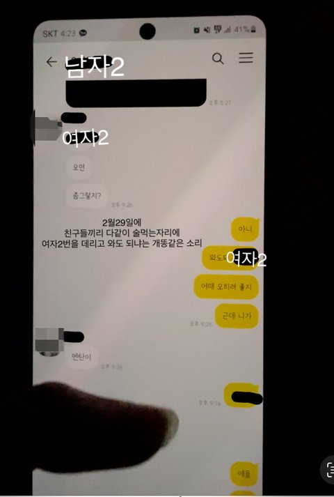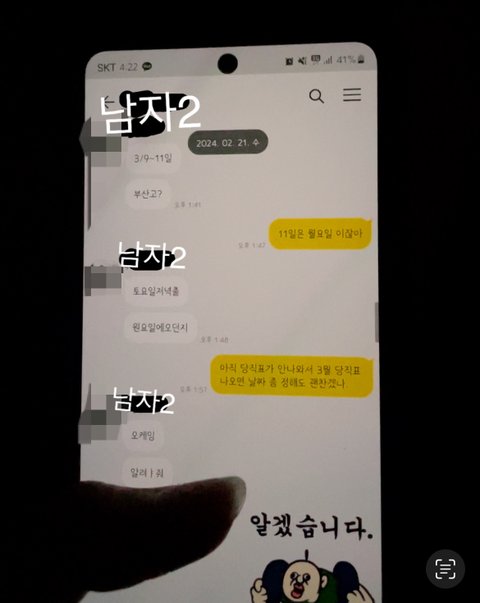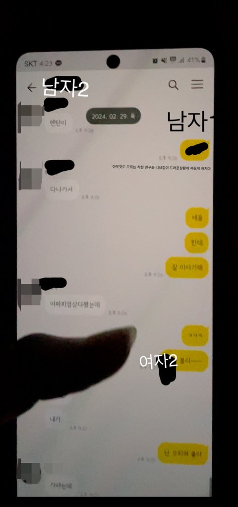 그 사이동안 남자1번은 일주일에 한두번만 집에 들어오고 나머지는 외박을 한 상태임 중간 생략후 3월1일 새벽 2시정도에 남자1번이 술을 먹고 집에 들어와서 같이 침대에누워 잠이든후 남자1번 핸드폰을 확인하는데 자기 친구 남자2번이랑 톡 내용이 이상한거임 2월29일에 피해자2번이 피해자1번과 남자2번 친구들한테(남자1번 포함) 어떤 여자를 아냐고 물어본 상황이었음 자기 남편이 바람이 났는데 알고 있냐고 물어본 상황에 남자 1번과 남자 2번은 톡내용에 그 여자 이름을 얘기하며 걸리지 않게 조심하라는 내용이었음