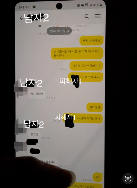 피해자1번은 촉이 안좋아 남자1번 깨톡 기프트콘 선물하기랑 깨톡 송금하기 목록을 본후 의심가는 사람 한명을 발견 근데 그 사람을 번호 저장도 안해놓고 깨톡에 숨겨놓기를 한 상태임