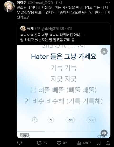 제니 카리나 주어만 바꾸는 걔가 엔터판 분탕 원인임 걔가 리사 로제 윈터 다 돌려까고 댓글에 홍은채 선글라스짤로 시작해서 릇 슴퀴 트와..