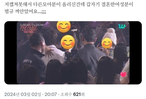 오늘 팬라이브에서 팬이랑 만나는 장면 되게 많았는데 아티스트 허락 없이 어깨 터치 하거나 저렇게 함부로 끌어안는 거 다 성추행 혐위임...