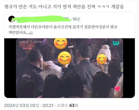유부녀가 결혼기념일인데도 불구하고 범규 안겠다고 팔 벌려서 끌어안고 방방 뛰면서 끝까지 안 놓아줌