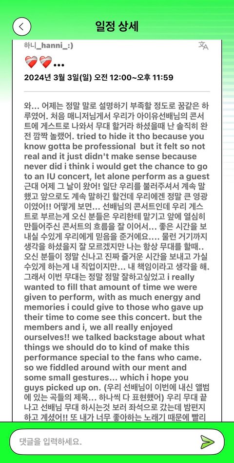 뉴진스 하니 아이유 콘서트 후기 장문으로 남겼당
