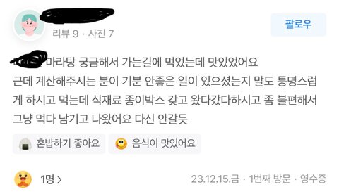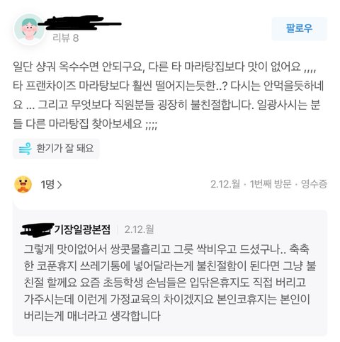 오늘 한 시 쯤에 친구랑 놀다가 부산 기장군 일광읍에 한 마리탕 집에 들르게 되었습니다. 탕화쿵푸, 라쿵푸만 먹어본 저는 처음 보는 체인점이더라구요. 들어가자마자 인사가 아니라 “머리부터 묶어 주세요.”라서 인사하던 저랑 친구는 당황했지만 그렇다하니(재료에 머리카락이 들어가게 하지 않게 하기 위해서라고 되어 있더라구요.) 일단 고무줄이 있었던 저부터 머리를 묶고 재료를 담기 시작했어요. 그렇게 담다가 청경채가 있길래 담으려는데 크기가 너무 크더라구요. 그래서 집게로 하나씩 뜯기 시작했는데 채소 특성상 생채기가 났어요.(생채기 난 채소를 내버려 두려 하지도 않았고 뜯어보려 했습니다.) 근데 옆에서 재료 담기를 자꾸만 부담스레 보시던 40? 50대로 보이는 여성 직원분께서 이렇게 담으시면 채소에 상처가 나서 못 판다고 하셔서 저도 그렇게 수긍하고 그럼 생채기 난 잎을 잘라서 담아주실 수 있을까요라고 물었더니 그렇게 절대 안 된다 하시더라구요.(가게 내에서 뜯기 쉽게 손질하거나 적당한 크기로 진열해둬야지 왜 이게 소비자의 몫이 되나요?) 근데 청경채 잎이 5개씩 뭉쳐 있음 그러려니 담겠는데 이건 무슨 김장 김치마냥 큰 덩어리를 다 담으라 하니 기가 차서 “이걸 다 담으라구요? 제가 생채기 낸 부분이 두 잎인데 이걸 다 담는 건 좀 그런 거 같아요.”라 하니 짜증을 내시는 겁니다. 그러면서 실랑이를 하다 그 여성 직원분께서 반말을 하시며 이걸 어떡하라고~ 이런 식으로 말씀하시기에 저도 기분이 나빠 반말 하지 마시라까지 했습니다. 아~ 예 안 할게요라는 퉁명스런 대답까지 참고 계속 말다툼을 하다가 그럼 저희에게 안 팔겠다 하셔서 그럼 팔지 마라 하시고 밖으로 나가려는데 주방에 계시던 분은 “와 음식 진짜 먹을 줄 모르네.” 그 50대 직원분께서는 “진짜 미친년 아니가?”라는 말소리가 들려 오더군요. 그 순간 화가 나 “뭐요? 미친년이요?”하고 가던 발길을 돌려 물어보니 대뜸 저에게 성큼성큼 다가 오시더니 “그럼 니가 미친년이지! 이걸 뭐 우예 팔라고!”라시며 직접 본인 손으로 청경채 해체쇼를 하시더라구요…(멀쩡한 부분까지 결국 본인 손으로 죽죽 찢으심) 그러고 눈을 부릅 뜨시며 절 쳐다보시는데 40~50 먹으신 분이 10대를 상대로 온갖 욕을 하시며 그러시는 걸 보고 무척이나 놀랐습니다… 본사 번호를 몰라 글 써봐요ㅠ.ㅠ… 리뷰 보니 저같이 불친절함에 당하신 분들 꽤 있어 보이네요. 나와서 너무 어이가 없길래 분함에 엄청 울었네요… 나가면서 __련 소리도 듣고 너무 어이가 없네요ㅋㅋ…