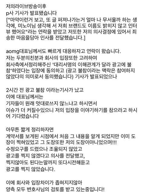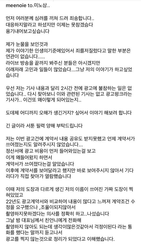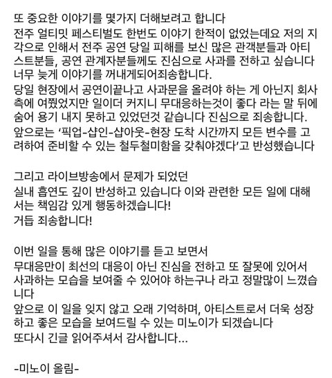 미노이 광고 펑크사건 해명문