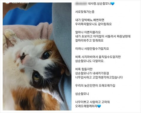 삼색이라고 이름이 삼순이인 암컷한테 2019년부터 밥을줬음