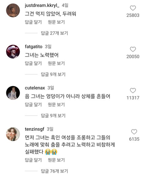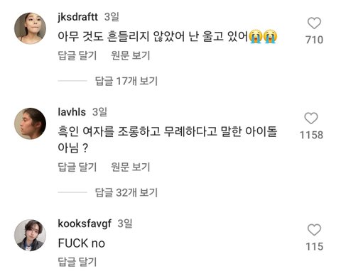 웬디 흑인비하도 웃긴게ㅋㅋㅋ 방송에서 웬디가 자기 유학시절 썰을 풀었고 mc였던 강호동이 거기도 사투리처럼 말투가 다양하냐 물음. 그래서 웬디가 자기 백인 친구들은 말투가 러블리했고 흑인 친구들은 파워풀했다고 함. 자기 친구 이야기라 흑인들 싸잡는 것고 아닐 뿐더러 조롱워딩도 없음ㅋㅋㅋ 흑인들 다른 인종이 레게만 해도 패고 가사에 '니가' 들어가면 흑인 혐오 단어랑 발음 비슷하다면서 인종차별이라고 패고 하여간 동양인이 제일 만만함