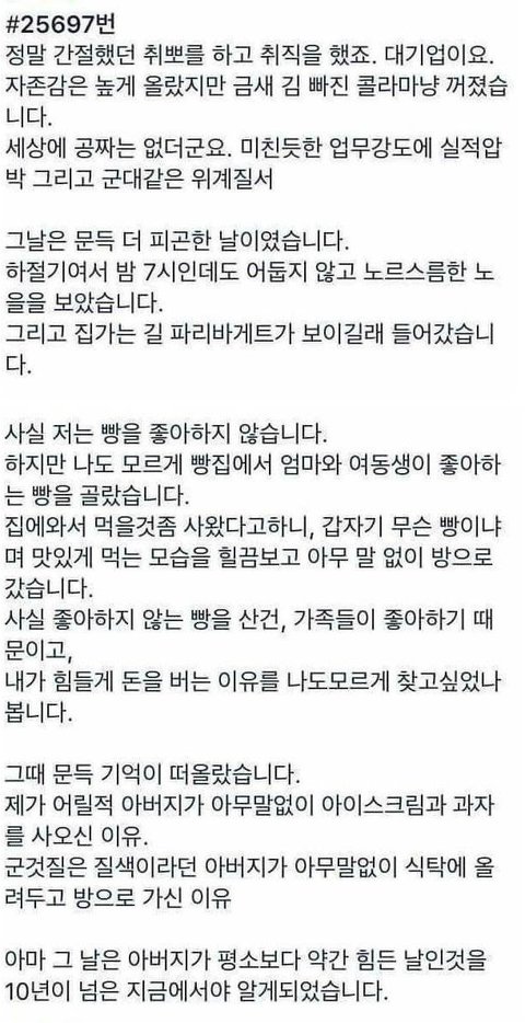 왜 울컥하지... 어릴때 아빠가 사오던 센베이 과자, 통닭, 잘 입을것 같지도 않았던 촌스러웠던 내 잠바... 아빠 가신지 벌써 17년이네요. 그립습니다