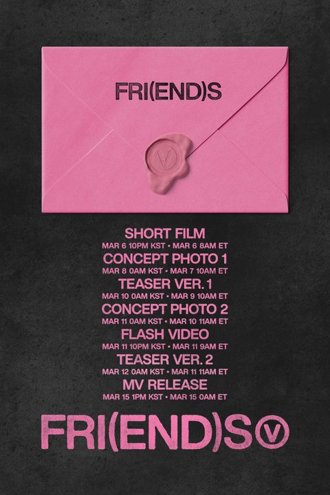 빅히트 뮤직은 3월 5일 0시(이하 한국시간) 방탄소년단의 공식 계정에 영문 'V' 인장이 찍힌 핑크색 편지봉투와 프로모션 콘텐츠 공개 일정이 담긴 'FRI(END)S'의 프로모션 스케줄을 게재했다.