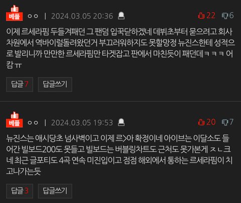 릇저씨들은 왜 니네 그룹이 그렇게 비호감 사는걸까 의문만 가지지 말고 느그 하는짓거리를 되돌아보셈 ㅋㅋㅋㅋ 다른 그룹들 성적 자랑글 봐봐 첫베플부터 타그룹 머리채 잡으면서 지 그룹 올려치는 팬덤이 있어? 니네만 그래 니네만 ㅋㅋㅋㅋㅋㅋ 그래놓고 맨날 왜 르세라핌만 미워해 징징 ㅜㅜㅜ 니네가 미움받을 짓거리를 하니까요 ^^