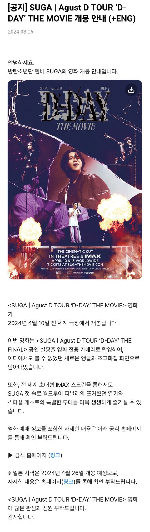 SUGA | Agust D TOUR ‘D-DAY’ THE MOVIE 개봉 안내