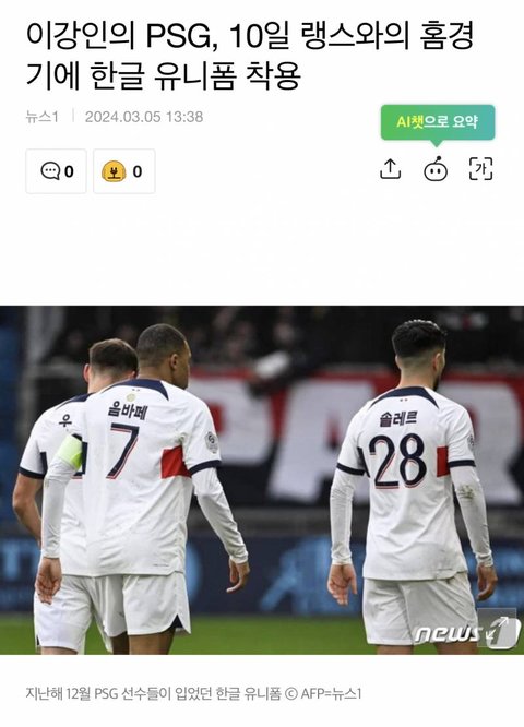이강인의 PSG, 10일 랭스와의 홈경기에 한글 유니폼 착용