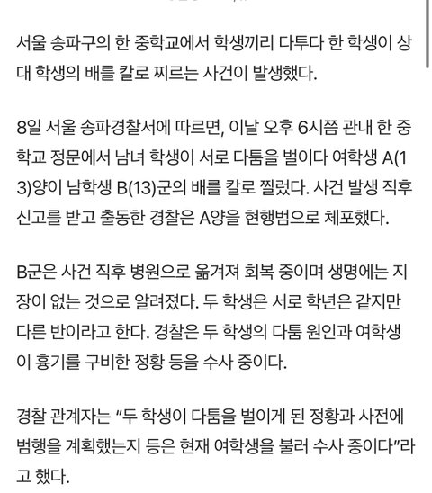 송파구 아o중학교임 뉴스에선 만 13세라는데 소문으론 3학년이라는데 뭐라 맞는지 모르겠다