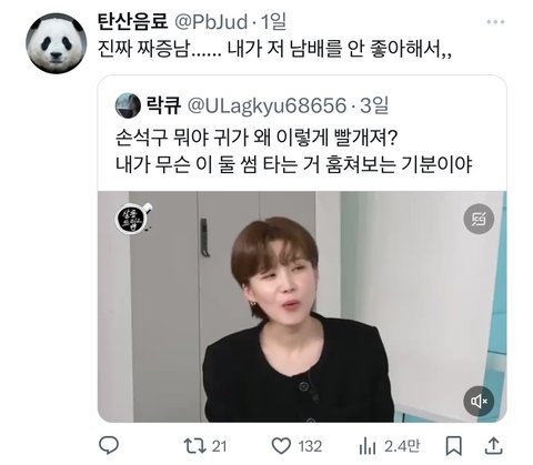 뭐 안좋아할순 있지. 근데 별개 다 짜증난다 그러네 ㅋㅋㅋㅋ 지가 장도연 팬도 아니면서 여자연예인이 남자연예인이랑 그렇고 그런 기미 보이면 무조건 남자쪽 몰아가고 우리언니 지켜!! ㅇㅈㄹ떠는애들... 으 개싫어 진쩌 ㅋㅋㅋㅋㅋ
