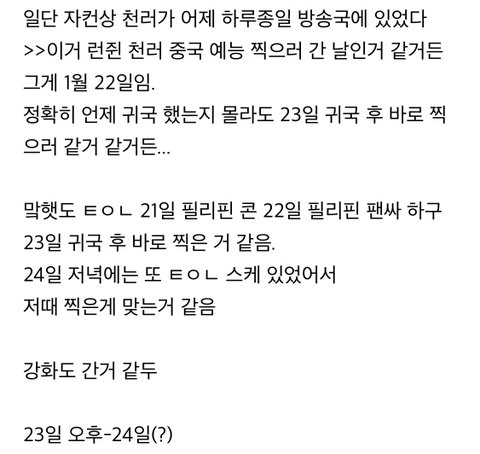 추측글 보면 시기상 애들 진짜 바빴을 때 시간 짬내서 찍은건데 애들한테 뭐라고 하지마라 좀 ㅠㅠ 우리가 칠링 좋아하는거 알고 바쁜 와중에도 찍은거 같은데 또 영상보면 엄청 추워보여서 맘아픔.. 간만에 기다리던 칠링 올라왔는데 마플 타지말고 재밌게 보자 그냥 즐겨
