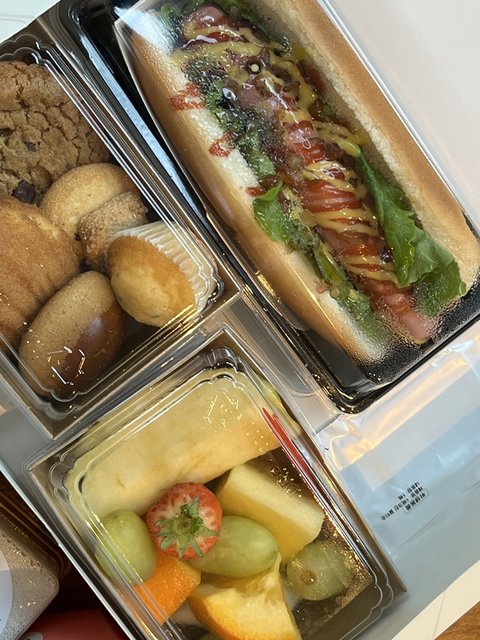 돌떡, 핫도그, 빵, 과일, 음료