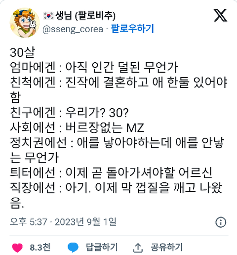 30세만 그런것처럼 생각말게. 어떤 나이든 상대적인거니까. 60대는? 직장이나 학교에서는 노인이지. 노인정가면 젊은이가 노인정 왜 오냐고 쫓아내더라ㅋ