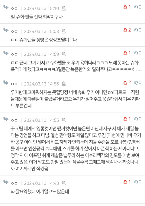 뭐라 하냐고 슈화팬들이 피코질 하면서 멤버들 쳐 팼거든..ㅎ