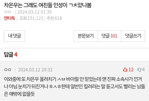 아니 근데 차은우가 연애를 들킨것도 아니고 일반인이랑 연애를 몇번했는지도 모르는데 차은우를 욕해야됨? 저런걸로 영업하는게 차은우 팬이겠냐고 걍 네티즌들이 호들갑 떠는건데 차은우를 욕해야됨??