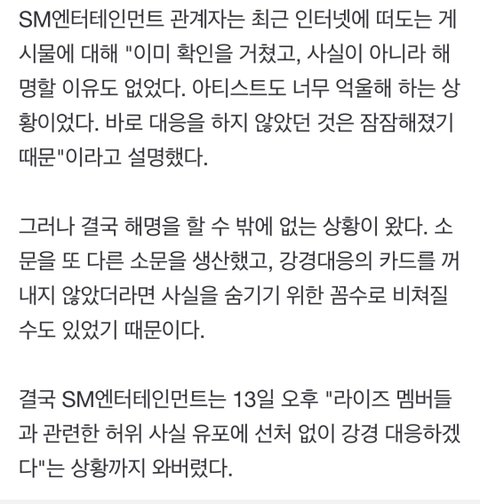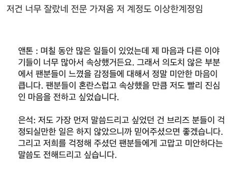 브리즈 분들이 걱정되실 만한 일은 하지 않았다 이거면 끝난 거 아닌가? 소문을 전면 부인한 건데 무슨 말이 더 필요하고 사과가 필요하냐