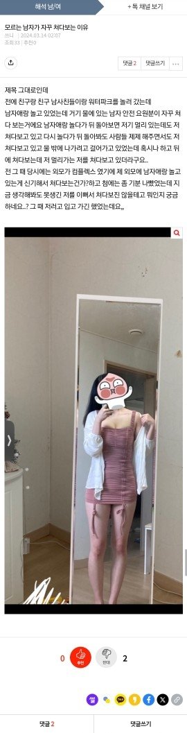 (본인 사진이 맞으면 저에 대한 악의: 글 내용상 야하게 입어놓고 인기 많다고 착각하는 여자처럼 보이도록 한 것-를 확인할 수도 있으며)