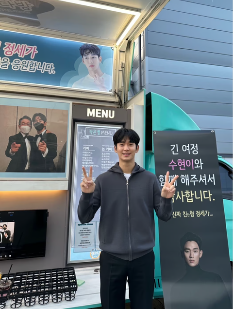 보내준 커피차 앞에서 야무지게 인증샷도 남긴 김수현