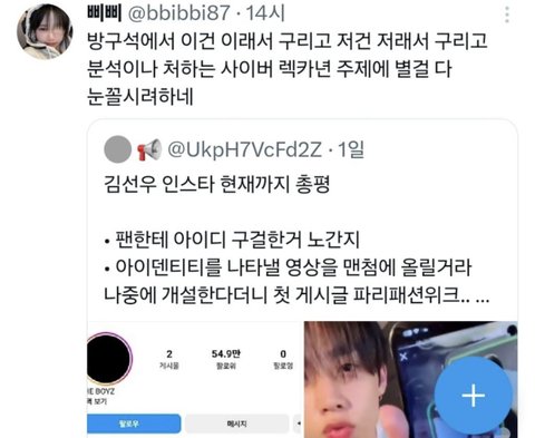 스타일기 찍은 이후로 남돌팬들한테 개찍혔던데 좀 불쌍함 ㅋㅋ 그나저나 트위터에 진짜 어나더 정신병자들 많긴 하더라 ㅈㄴ 그사세임