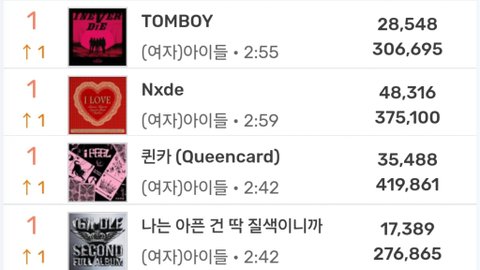 4연속 탑백 1위 이게 아이들이야 나 울어 네버버 고생했다!! 네임드들도 으싸으싸 하는 분위기던데 기세를 몰아 음방 돌거나 아딱질색 PAK까지 갔으면 좋겠음 아이네버다이 ㄹㅈㄷ 그리고 별개로 스밍팀 일 ㅈㄴ 잘해