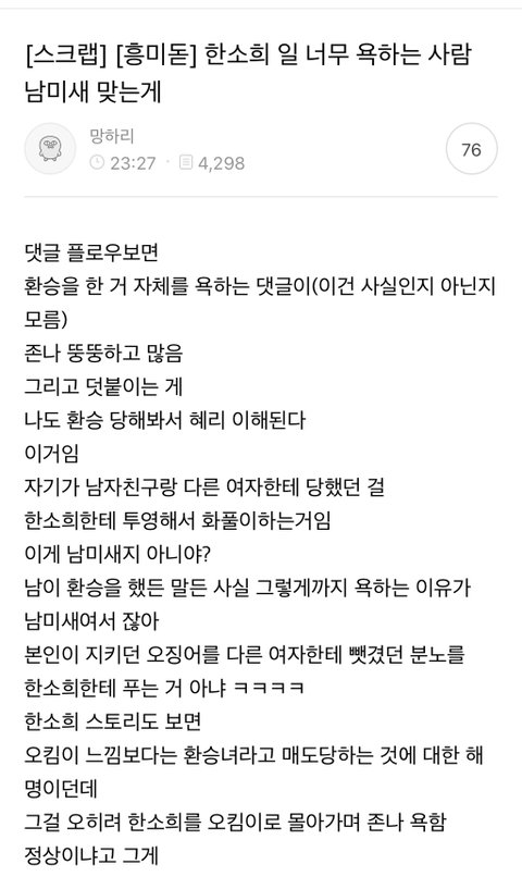 아 그래?ㅋㅋㅋㅋㅋㅋㅋㅋㅋㅋ난 반대로 쉴드치는 애들 보면 환승녀였던 경험이 있어서 공감하나 싶던데 ㅋㅋㅋㅋㅋㅋㅋㅋㅋㅋ 물론 안물안궁인 전남친환승경험당한 썰풀며 비난하는 애들도 웃기겟지 근데 단순히 남자에 미쳐서가 아니라, 다들 뭔지 알거임 그 쌔했던 기간동안 의심하는 자기자신이 참 못낫는데 결국 그게 다 맞았구나 하는거. 혜리가 올린 스토리 그 한마디가 수많은 여자들의 공감을 산거지. 기간상 보면 류씨랑 혜리 사이에서도 서로 정확히 헤어진 시점이 다를수도 있는거같고, 근데 그런 부분은 보면 정확히 헤어졌는데도 구질구질 매달리고 스토킹하는 최악의 경우 제외하고, 서로 애매모호하게 연락 이어가고 여지줘서 그런 경우가 태반임. 비슷한 경험 해본 자들은 대충 말해도 다 알거임ㅋㅋㅋ 그리고 그 패턴에 꼭 현여친의 급발진도 많이들 경험했을거고. 그래서 결론은 남자가 제일 문제라 생각해서 류를 원망하는 여론도 있는거야. 뭔가 제대로 연애 안해봤거나 본인이 환승녀거나 하는 애들은 이해못하는게 당연하긴 함ㅋㅋㅋ 여초라 하면 연애 잘 못하는 애들 태반이니까 저런 반응도 이해는 감ㅋㅋㅋ