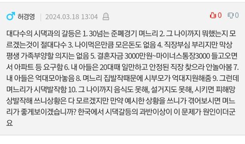 닉부터 맛이 간 사람인데요.. 저런사람 댓글만 봐도 정상적인 삶이 불가능한거 같은데... 나도 그렇고 주변만 봐도 저런 고부갈등 있는 집안 흔치 않은데요. 딸둘에 아들하나집안이지만 솔직히 고부갈등은 남자가 ㅄ일때 생긴다고 생각합니다. 저런 닉넴 쓸정도면 어떤삶을 살았는지도 그렇고... 정신세계가 궁금해 지는 분이네요...ㅎ