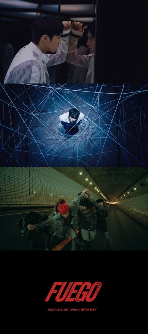 공개된 영상에는 끝이 보이지 않는 터널과 차가운 거울로 온통 둘러싸인 벽, 몸을 움직이지 못하게 옭아맨 줄 틈, 두 걸음을 채 걷지 못하는 좁은 방 등에 갇혀 혼란을 겪는 멤버들의 모습이 담겼다. 이어 강렬한 비트와 사이렌 소리로 귀를 자극하다 'FUEGO'라는 가사가 터져 나오자, 여섯 명의 멤버는 각자를 고통스럽게 하던 공간을 벗어나 한 데 모여 다음 스텝을 준비하는 듯 보인다.