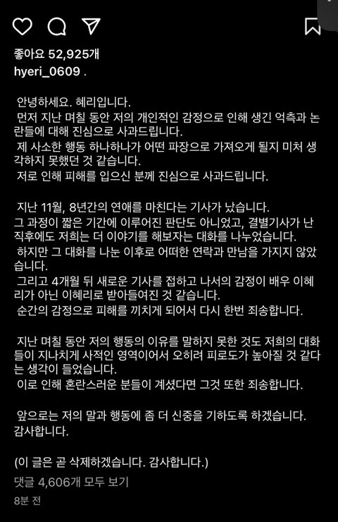 새로운 사람에게 호감이 생겼으면 먼저 혜리 쪽에 연락해서 확실히 정리를 했어야지 어쨌든 결별기사는 났지만 이야기를 나눠보기로 했고 둘의 관계는 제대로 정리가 안된거였는데 그러고 얼마뒤 열애한다 뜨면 혜리쪽은 열받지..