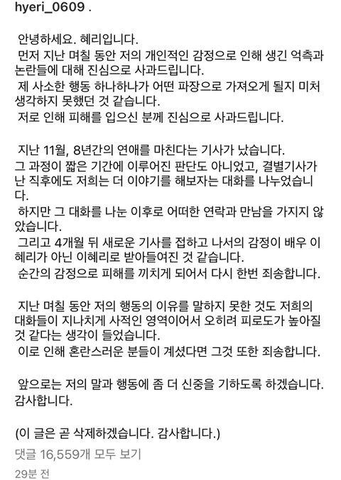 거봐 혜리가 잘못한거임. 류준열이 바보도 아니고, 어떠한 연락도 안하고 4개월 지냈으면 끝이지. 준열이만 혜리한테 전화해야해??? 안끝났다고 생각하면 혜리가 연락했어야지. 지가 더 좋아하고 기다렸구만 왜기다려? 준열이가 기디리랬어? 니가 전화했음 되는거 준열이한테 탓을 떠 넘기는구만. 아님 니가 전화했는데 준열이가 차단을 한것도 아니고. 준열이도 혜리 연락기다렸는데 연락없어서 끝났다 생각할수있는건데 너는 마치 기다리고있는 여자마냥 어필하고 상대를 바보만드냐