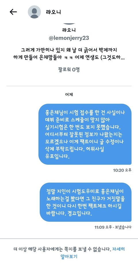 은채가 한림예고 오디션을 봤지만 두 번이나 떨어졌다는 얘기 나는 팩트를 아니까 진짜 애 한 명 죽이려고 발악을 하는구나 싶었음 근데 인용에 그걸 믿는 애들도 태반이라 이건 좀 아니다 싶어서 계정주에게 디엠 저렇게 보냄