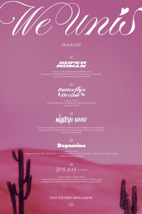 이에 따르면 유니스의 데뷔 앨범에는 타이틀곡 'SUPERWOMAN'을 포함해 'Butterfly's Dream(버터플라이즈 드림)', 'Whatchu Need(왓츄 니드)', 'Dopamine(도파민)', '꿈의 소녀(Dream of girls)'까지 총 다섯 곡이 수록된다.