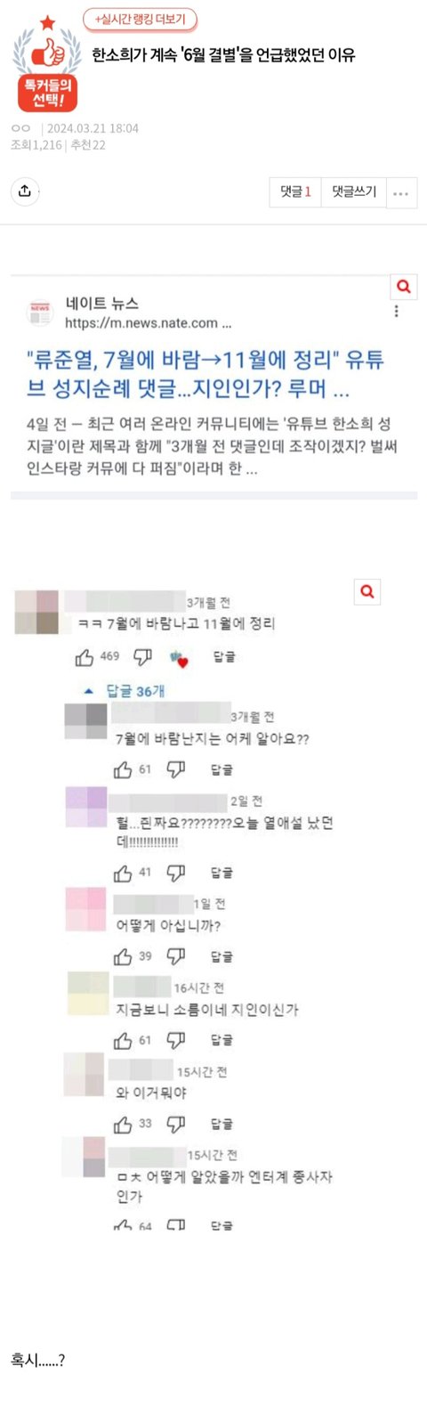 밑에 생파, 6월 결별 어쩌구 그거 한소희와 류준열쪽이 퍼뜨린 구라인거 이미 다 밝혀졌는데 그걸 들고오네ㅋ 생파는 애초에 하지도 않았는디? 6월 결별도 한소희가 구라친 내용이고