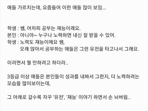 노력이 제일 중요한다 결국 노력 안하고 재능,유전 핑계 되고 있음