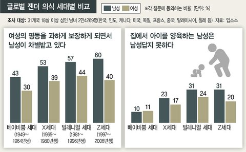입소스는 한국과 인도, 미국, 독일, 칠레 등 31개국 18살 이상 성인 남녀 2만4269명을 대상으로 한 조사를 토대로 “엠제트(MZ·밀레니얼과 제트) 세대, 특히 이들 중 남성은 자신의 윗세대보다 성평등을 지지하지 않는다”고 했다. 조사는 베이비붐 세대(1949~1964년생)와 엑스(X) 세대(1965~1980년생), 밀레니얼(1981~1996년생)과 제트 세대(1997~2006년생)를 나눠 비교했다.