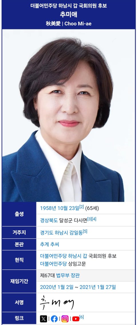 (사진2 설명) 추미애(秋美愛, Choo Mi-ae) 전 법무부장관/더불어민주당 하남시 갑 국회의원 후보 <출처 : NAVER 나무위키>
